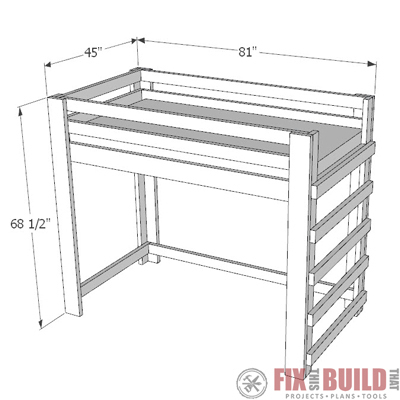 The DIY Loft Bed is a great addition to an kid or college student’s room. It is sized for a twin mattress and stands 68 1/2” tall with plenty of room for a reading, playing or studying nook below. Construction is very easy with simple 2x6 and 2x4 materials which also make it inexpensive to build. It’s a great weekend project that will add a lot of space to a room.